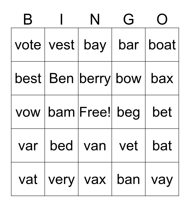 This bingo card has a free space and 26 words: van, ban, berry, very, boat, vote, best, vest, bet, vet, bow, vow, bat, vat, bam, vam, bar, var, bay, vay, bax, vax, beg, bed, Ben and ven.