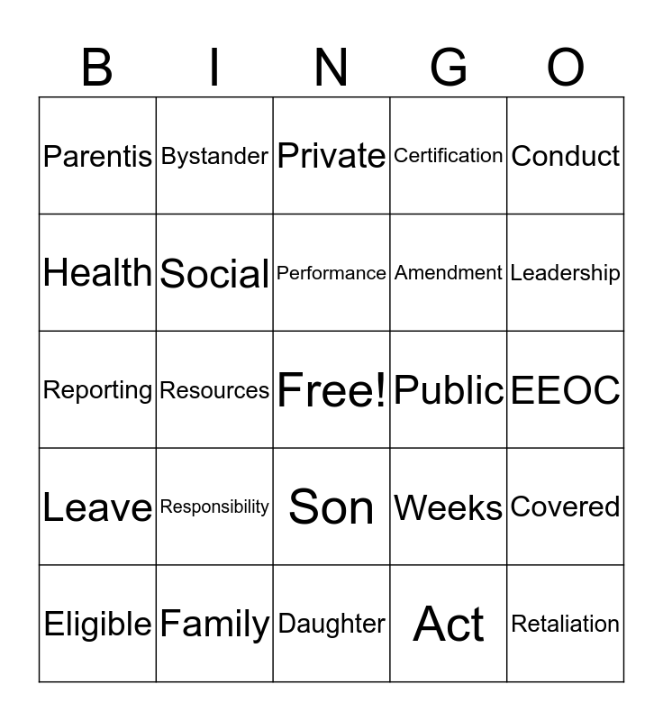 This bingo card has a free space and 60 words: Harassment, Family, Medical, Leave, Act, 1993, Social, Media, Amendment, Exigency, Certification, Serious, Health, Condition, Family, Parentis, Retaliation, Conduct, Charges, Performance, Public, Private, Eligible, Covered, Persistent, Unwelcome, Compelling, Report, Leadership, Accountability, Risk, Training, Civility, Compliance, Bystander, Workplace, Unlawful, Resources, Time, Reporting, Policy, Responsibility, EEOC, DOL, Weeks, Fitness, Duty, Manager, Employee, Son, Daughter, Intermittent, Leave, Schedule, Status, Treatment, Incapacity, Medical, Military and Confidential.