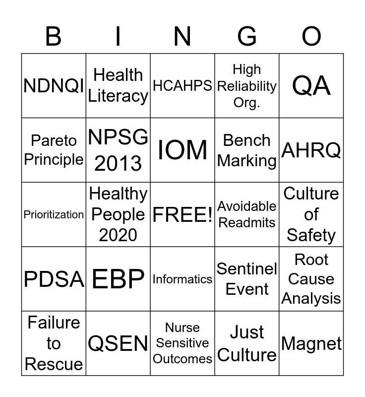 This bingo card has a free space and 24 words: EBP, QSEN, IOM, Failure to Rescue, QA, NDNQI, Pareto Principle, Health Literacy, Avoidable Readmits, Informatics, Bench Marking, Prioritization, Sentinel Event, Root Cause Analysis, NPSG 2013, Just Culture, Culture of Safety, HCAHPS, AHRQ, Healthy People 2020, Magnet, PDSA, High Reliability Org. and Nurse Sensitive Outcomes.
