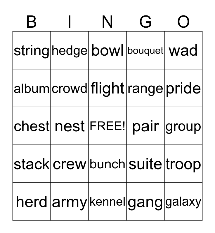 This bingo card has a free space and 24 words: crew, army, flight, herd, wad, string, album, hedge, pair, bunch, range, chest, suite, troop, crowd, gang, group, bowl, pride, nest, galaxy, stack, bouquet and kennel.