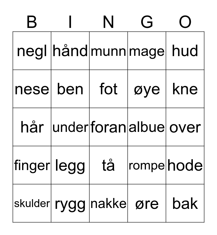 This bingo card has 28 words: hode, ansikt, øye, øre, nese, munn, hånd, finger, albue, skulder, hår, mage, rygg, nakke, kne, lår, legg, ben, fot, tå, negl, bak, foran, under, over, rompe, hud and tunge.