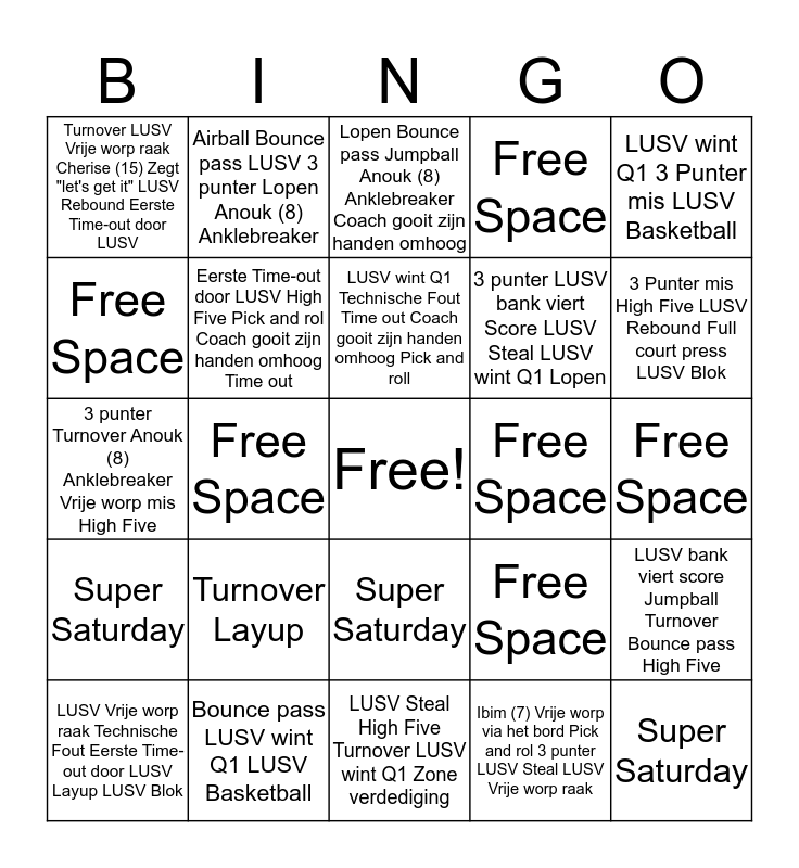 This bingo card has a free space and 240 words: Super Saturday, Airball Jumpball Vrije worp mis Turnover LUSV Score, LUSV wint Q1 LUSV Steal LUSV bank viert score Eerste Time-out door LUSV Zone verdediging, Coach gooit zijn handen omhoog Anouk (8) Anklebreaker LUSV Basketball, Free Space, LUSV Rebound 3 Punter mis, Turnover Lopen Jumpball 3 punter LUSV Blok, Time out Coach gooit zijn handen omhoog Zone verdediging High Five LUSV wint Q1, Super Saturday, 3 punter LUSV Rebound Turnover Jumpball Ibim (7) Vrije worp via het bord, LUSV Score Bounce pass Lopen Zone verdediging LUSV wint Q1, Technische Fout 3 Punter mis LUSV Basketball, Free Space, Time out Meike(14) of Tessa(11) double double, Time out Coach gooit zijn handen omhoog High Five High Five Vrije worp mis, LUSV Score LUSV 3 punter Lopen LUSV Vrije worp raak Eerste Time-out door LUSV, Super Saturday, Lopen Bounce pass Jumpball Anouk (8) Anklebreaker Coach gooit zijn handen omhoog, Time out 3 punter Turnover Ibim (7) Vrije worp via het bord Layup, Bounce pass High Five LUSV Basketball, Free Space, LUSV Steal Turnover, Pick and rol Eerste Time-out door LUSV LUSV Blok LUSV Score LUSV Steal, Airball Zone verdediging Turnover LUSV 3 punter LUSV wint Q1, Super Saturday, Turnover LUSV Rebound Zone verdediging Bounce pass Cherise (15) Zegt "let's get it", LUSV bank viert score Turnover 3 Punter mis Cherise(15) Jumpball, Airball Turnover LUSV Basketball, Free Space, LUSV Blok LUSV 3 punter, Uitboksen Full court press LUSV Score Zone verdediging Pick and rol, Airball Layup LUSV Blok Technische Fout Technische Fout, Super Saturday, 3 punter Cherise(15) Time out LUSV Score LUSV Rebound, 3 punter Zone verdediging LUSV 3 punter 3 Punter mis LUSV wint Q1, 3 Punter mis LUSV bank viert score LUSV Basketball, Free Space, Uitboksen Turnover, LUSV Vrije worp raak Time out Pick and rol Layup LUSV Blok, Airball Jumpball Turnover Zone verdediging Airball, Super Saturday, LUSV wint Q1 LUSV Rebound Jumpball Turnover LUSV Vrije worp raak, 3 Punter mis High Five LUSV Rebound Full court press LUSV Blok, Bounce pass Cherise (15) Zegt "let's get it" LUSV Basketball, Free Space, Vrije worp mis Turnover, 3 punter Turnover High Five LUSV Steal LUSV 3 punter, Airball Turnover Zone verdediging Lopen Meike(14) of Tessa(11) double double, Super Saturday, LUSV wint Q1 Technische Fout Time out Coach gooit zijn handen omhoog Pick and roll, Turnover Jumpball Airball LUSV Vrije worp raak LUSV Score, Technische Fout LUSV Rebound LUSV Basketball, Free Space, Time out Turnover, 3 punter Zone verdediging Cherise (15) Zegt "let's get it" LUSV Blok, 3 punter LUSV Vrije worp raak Meike(14) of Tessa(11) double double Vrije worp mis LUSV Steal, Super Saturday, Vrije worp mis High Five 3 punter Jumpball, 3 Punter mis Time out LUSV bank viert score 3 punter Zone verdediging, LUSV bank viert Score High Five LUSV Basketball, Free Space, LUSV Vrije worp raak LUSV Blok, Technische Fout LUSV Vrije worp raak Eerste Time-out door LUSV Vrije worp mis Turnover, Layup Turnover Cherise (15) Zegt "let's get it" Time out Ibim (7) Vrije worp via het bord, Super Saturday, LUSV Vrije worp raak Technische Fout Eerste Time-out door LUSV Layup LUSV Blok, LUSV Score Pick and roll LUSV 3 punter LUSV 3 punter Time out, Technische Fout High Five LUSV Basketball, Free Space, Cherise (15) Zegt "let's get it" Bounce pass, Layup Time out High Five LUSV Blok, Turnover Cherise(15) Full court press 3 punter LUSV Vrije worp raak, Super Saturday, LUSV Blok Technische Fout LUSV Score Lopen LUSV bank viert Score, Layup 3 punter LUSV Steal Layup Bounce pass, Time out Lopen LUSV Basketball, Free Space, Uitboksen Cherise(15), Bounce pass LUSV Blok Airball Jumpball Jumpball, Time out 3 Punter mis LUSV Vrije worp raak Turnover 3 punter, Super Saturday, LUSV bank viert score Jumpball Turnover Bounce pass High Five, Full court press Zone verdediging Pick and roll Coach gooit zijn handen omhoog Full court press, Cherise(15) Technische Fout LUSV Basketball, Free Space, Time out Turnover, 3 punter LUSV Vrije worp raak LUSV wint Q1 Layup LUSV Score, LUSV Vrije worp raak Anouk (8) Anklebreaker High Five LUSV Vrije worp raak, Super Saturday, Technische Fout 3 Punter mis LUSV Rebound Airball LUSV Blok, Technische Fout Uitboksen Bounce pass LUSV Steal Ibim (7) Vrije worp via het bord, Bounce pass LUSV bank viert Score LUSV Basketball, Free Space, LUSV Score LUSV Blok, LUSV bank viert score Uitboksen Full court press 3 punter LUSV wint Q1, LUSV 3 punter 3 punter Lopen Time out Anouk (8) Anklebreaker, Super Saturday, 3 punter LUSV wint Q1 LUSV Blok Coach gooit zijn handen omhoog LUSV 3 punter, Pick and roll LUSV 3 punter Bounce pass Pick and rol LUSV Steal, Full court press 3 punter LUSV Basketball, Free Space, Technische Fout LUSV Score, Turnover LUSV Vrije worp raak Cherise (15) Zegt "let's get it" LUSV Rebound Eerste Time-out door LUSV, Lopen High Five Time out 3 Punter mis Layup, Super Saturday, Meike(14) of Tessa(11) double double Pick and roll Layup LUSV wint Q1, LUSV Vrije worp raak 3 punter Turnover Technische Fout Turnover, LUSV Vrije worp raak Zone verdediging LUSV Basketball, Free Space, Anouk (8) Anklebreaker Jumpball, High Five LUSV Steal Airball Time out LUSV 3 punter, LUSV Score LUSV Blok Cherise(15) LUSV Steal LUSV Vrije worp raak, Super Saturday, 3 punter Zone verdediging Technische Fout LUSV Vrije worp raak 3 Punter mis, Pick and roll LUSV Vrije worp raak Coach gooit zijn handen omhoog Time out 3 punter, LUSV Rebound Layup LUSV Basketball, Free Space, LUSV Rebound Vrije worp mis, Jumpball Time out Eerste Time-out door LUSV LUSV Steal Uitboksen, Eerste Time-out door LUSV LUSV 3 punter LUSV Vrije worp raak Bounce pass LUSV bank viert Score, Super Saturday, Ibim (7) Vrije worp via het bord LUSV Score Layup Technische Fout Zone verdediging, Eerste Time-out door LUSV Full court press 3 punter Vrije worp mis Jumpball, LUSV bank viert Score Coach gooit zijn handen omhoog LUSV Basketball, Free Space, Uitboksen LUSV Blok, Che