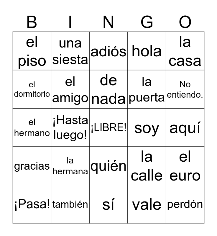 This bingo card has a free space and 26 words: quién, vale, de nada, también, la casa, el piso, el dormitorio, una siesta, aquí, la calle, la puerta, el hermano, el euro, ¡Pasa!, ¡Hasta luego!, último, hola, gracias, adiós, perdón, No entiendo., sí, soy, la hermana, el amigo and la amiga.