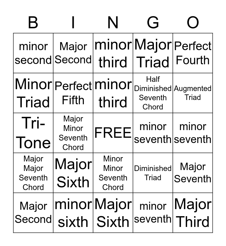 This bingo card has a free space and 24 words: Major Second, Major Sixth, minor third, minor seventh, Perfect Fourth, minor second, Major Second, minor third, minor seventh, minor seventh, Tri-Tone, Perfect Fifth, Diminished Triad, Major Seventh, Minor Triad, minor sixth, Major Sixth, Major Triad, Augmented Triad, Major Major Seventh Chord, Major Minor Seventh Chord, Minor Minor Seventh Chord, Half Diminished Seventh Chord and Major Third.