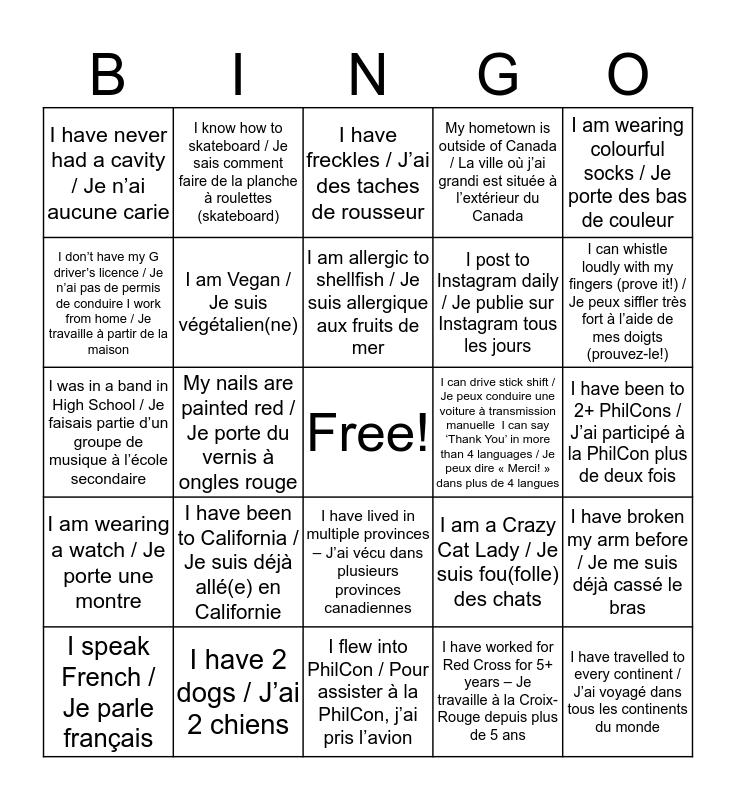 This bingo card has a free space and 36 words: I am Left Handed / Je suis gaucher(ère), I am the oldest child / Je suis l’aîné(e), I am wearing contacts / Je porte des verres de contact, I am Vegan / Je suis végétalien(ne), I am a Crazy Cat Lady / Je suis fou(folle) des chats, I am wearing a watch / Je porte une montre, I am allergic to shellfish / Je suis allergique aux fruits de mer, I am engaged / Je suis fiancé(e), I am wearing colourful socks / Je porte des bas de couleur, My name starts with ‘K’ / Mon commence par la lettre « K », My nails are painted red / Je porte du vernis à ongles rouge, My hometown is outside of Canada / La ville où j’ai grandi est située à l’extérieur du Canada, I can build a fire / Je peux faire un feu, I can drive stick shift / Je peux conduire une voiture à transmission manuelle I can say ‘Thank You’ in more than 4 languages / Je peux dire « Merci! » dans plus de 4 langues, I can whistle loudly with my fingers (prove it!) / Je peux siffler très fort à l’aide de mes doigts (prouvez-le!), I have never had a cavity / Je n’ai aucune carie, I have two children / J’ai deux enfants, I have been to California / Je suis déjà allé(e) en Californie, I have travelled to every continent / J’ai voyagé dans tous les continents du monde, I have freckles / J’ai des taches de rousseur, I have been to 2+ PhilCons / J’ai participé à la PhilCon plus de deux fois, I have broken my arm before / Je me suis déjà cassé le bras, I have 2 dogs / J’ai 2 chiens, I speak French / Je parle français, I flew into PhilCon / Pour assister à la PhilCon, j’ai pris l’avion, I know how to skateboard / Je sais comment faire de la planche à roulettes (skateboard), I was in a band in High School / Je faisais partie d’un groupe de musique à l’école secondaire, I drink tea instead of coffee / Je préfère le thé au café, I post to Instagram daily / Je publie sur Instagram tous les jours, I don’t have my G driver’s licence / Je n’ai pas de permis de conduire I work from home / Je travaille à partir de la maison, I started working at Red Cross in 2018 / J’ai commencé à travailler à la Croix-Rouge en 2018, My name is a palindrome – Mon nom est un palindrome, I have worked for Red Cross for 5+ years – Je travaille à la Croix-Rouge depuis plus de 5 ans, I have lived in multiple provinces – J’ai vécu dans plusieurs provinces canadiennes, I can play the ukulele – Je peux jouer du ukulélé and I have a pet that isn’t a dog or a cat / J’ai un animal qui n’est ni un chien ni un chat.