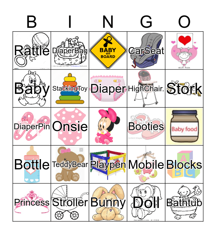 This bingo card has 24 images, a free space and 21 words: TeddyBear, Stroller, Diaper, Princess, Rattle, Baby, DiaperBag, Booties, Playpen, HighChair., DiaperPin, Mobile, Blocks, StackingToy, Doll, Stork, Onsie, Bathtub, Bottle, CarSeat and Bunny.