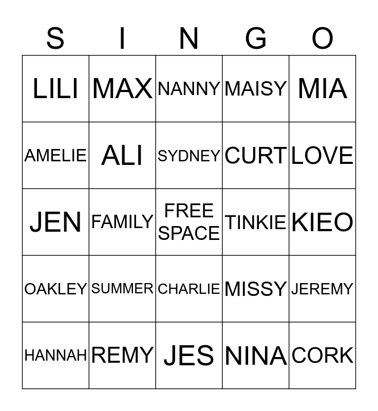 This bingo card has a free space and 24 words: SUMMER, REMY, SYDNEY, HANNAH, MIA, LILI, AMELIE, MAX, TINKIE, CHARLIE, CURT, JEN, MISSY, JEREMY, ALI, NINA, KIEO, NANNY, LOVE, FAMILY, CORK, OAKLEY, MAISY and JES.