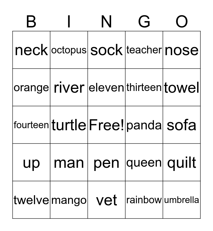 This bingo card has a free space and 24 words: man, mango, eleven, twelve, nose, neck, orange, octopus, panda, pen, thirteen, fourteen, queen, quilt, river, rainbow, sofa, sock, towel, turtle, umbrella, up, teacher and vet.