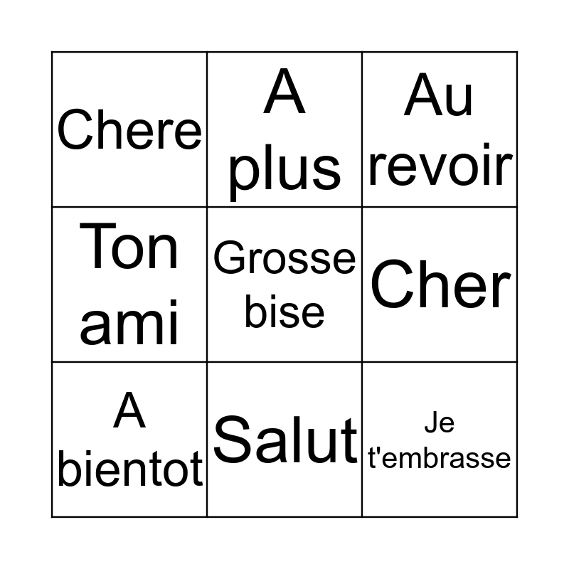 This bingo card has 11 words: Bisou, Grosse bise, Je t'embrasse, A bientot, A plus, Au revoir, Ton ami, Amitie, Cher, Chere and Salut.