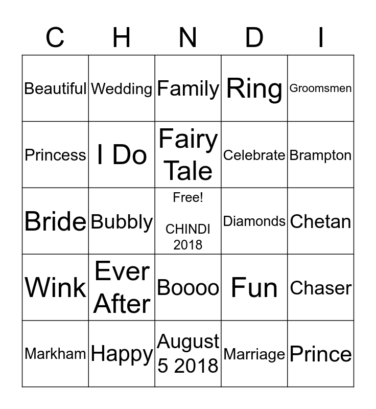 This bingo card has a free space and 34 words: Bindi, Aquarium, LOVE, Garba, Chetan, Princess, I Do, August 5 2018, Celebrate, Prince, Bride, Wedding, Marriage, Groom, Wink, Bubbly, Boooo, Diamonds, Chaser, Markham, Happy, Patels, Ring, Brampton, Bridesmaids, Ever After, Family, Friends, Groomsmen, Beautiful, Third Wheel, Fairy Tale, Fun and Latch.
