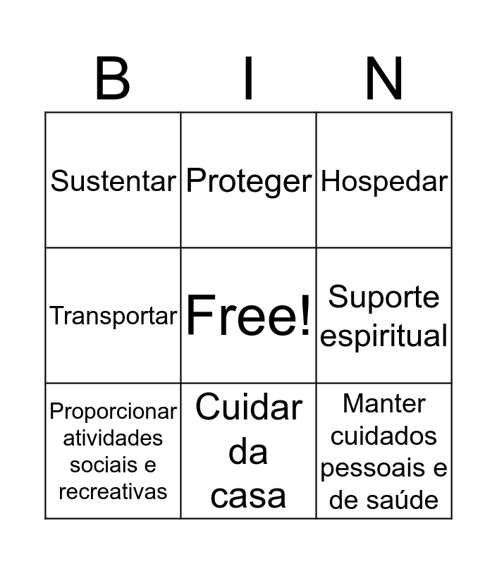 This bingo card has a free space and 10 words: Cuidar da casa, Hospedar, Sustentar, Manter cuidados pessoais e de saúde, Transportar, Proporcionar atividades sociais e recreativas, Proteger, Cuidar de questões legais e burocrácicas, Suporte espiritual and Apoio Psicológico.