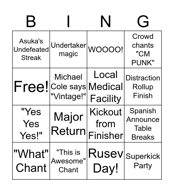 This bingo card has 16 words: "This is Awesome" Chant, Spanish Announce Table Breaks, WOOOO!, Asuka's Undefeated Streak, "Yes Yes Yes!", Undertaker magic, Kickout from Finisher, Rusev Day!, Free!, Michael Cole says "Vintage!", "What" Chant, Crowd chants "CM PUNK", Major Return, Distraction Rollup Finish, Local Medical Facility and Superkick Party.