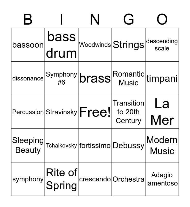 This bingo card has a free space and 25 words: Tchaikovsky, crescendo, brass, symphony, descending scale, bassoon, dissonance, bass drum, Transition to 20th Century, fortissimo, Romantic Music, Percussion, Debussy, Modern Music, Symphony #6, Musical Impressionism, La Mer, Woodwinds, timpani, Stravinsky, Adagio lamentoso, Rite of Spring, Sleeping Beauty, Strings and Orchestra.