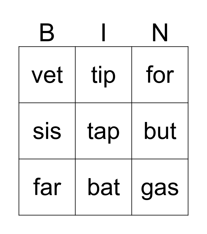 This bingo card has a free space and 8 words: but, for, tip, far, vet, gas, sis and bat.