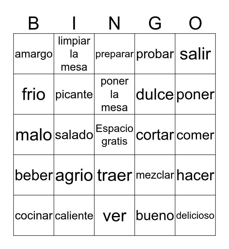 This bingo card has a free space and 24 words: agrio, caliente, poner la mesa, cocinar, salir, amargo, frio, limpiar la mesa, cortar, traer, dulce, malo, mezclar, hacer, picante, bueno, comer, preparar, poner, salado, delicioso, beber, probar and ver.