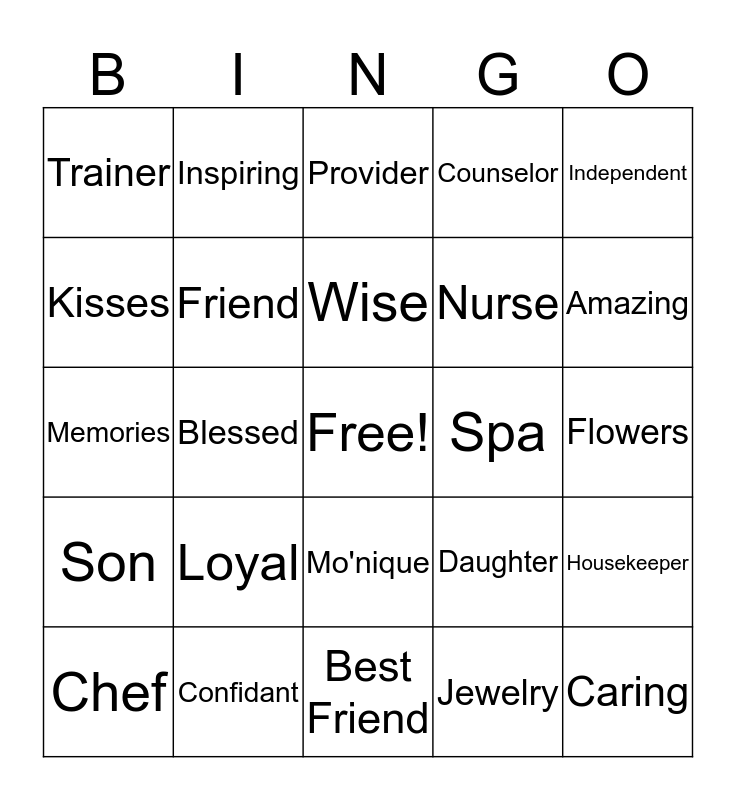 This bingo card has a free space and 47 words: Loving, Caring, Giving, Best Friend, Loyal, Missed, Inspiring, Pregnant, Kisses, Amazing, Friend, Counselor, Housekeeper, Daughter, Caring, Patient, Wise, Spa, Claire, Independent, Blessed, Jewelry, Trainer, Nurse, June, Amazing, Chef, Piper Laurie, Mo'nique, Son, Funny, Faye Dunaway, Super Hero, Grandma, Supporter, Confidant, Flowers, Carol, Cheerleader, Timeless, Singer, Provider, Memories, Strong, Blessing, Taxi Driver and Beautiful.