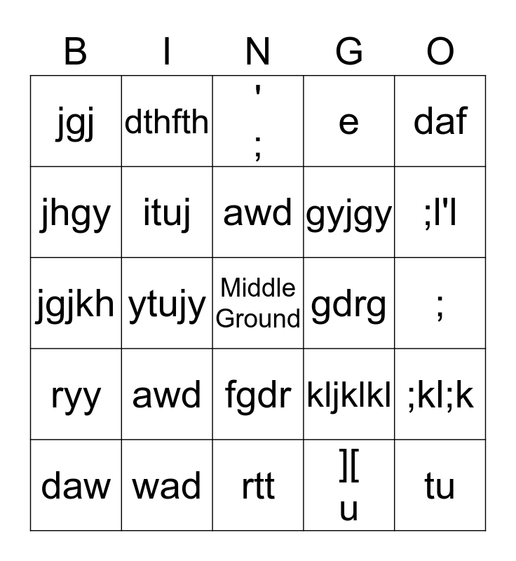 This bingo card has a free space and 24 words: awd, wad, awd, daw, daf, jgj, jhgy, dthfth, gdrg, fgdr, gyjgy, jgjkh, kljklkl, ;kl;k, ituj, ][ u, ;, ' ;, ;l'l, ytujy, tu, ryy, e and rtt.