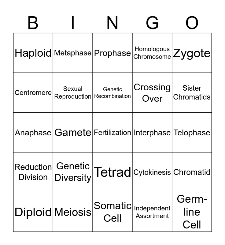 This bingo card has a free space and 24 words: Genetic Diversity, Meiosis, Genetic Recombination, Diploid, Zygote, Haploid, Centromere, Metaphase, Interphase, Tetrad, Crossing Over, Anaphase, Cytokinesis, Chromatid, Sexual Reproduction, Independent Assortment, Telophase, Prophase, Sister Chromatids, Gamete, Germ-line Cell, Reduction Division, Homologous Chromosome and Somatic Cell.