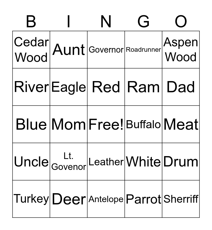 This bingo card has a free space and 24 words: Lt. Govenor, Deer, Red, Turkey, Aspen Wood, Cedar Wood, River, Aunt, Buffalo, Leather, Ram, Blue, White, Drum, Eagle, Parrot, Meat, Governor, Dad, Mom, Sherriff, Uncle, Roadrunner and Antelope.
