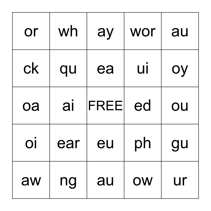 This bingo card has a free space and 24 words: ear, ng, ea, aw, au, or, ck, wh, ed, eu, ui, oa, ph, gu, qu, ow, ou, ay, oy, ai, ur, oi, wor and au.