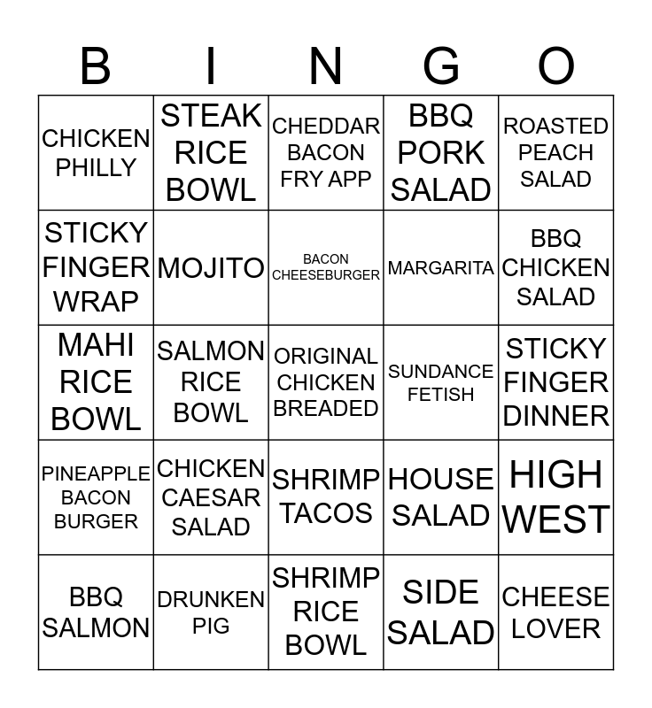 This bingo card has 105 words: Free!, ROASTED PEACH SALSA, ROASTED PEACH SALAD, ROASTED PEACH TACOS, RASPBERRY BROWNIE MOUNTAIN, REG. STICKY FINGER, LG. STICKY FINGER, REG. WING, LG. WING, JUMBO WING, COLOSSAL WING, CHIPS & SALSA, GUAC & CHIPS, STICKY QUESADILLA, ONION RINGS APP, GARLIC FF APP, CHEDDAR BACON FRY APP, WINGS AND THINGS, ALEHOUSE NACHOS, CHICKEN NACHOS, BBQ PORK NACHOS, ASPARAGUS, SW BRUSHETTA, STICKY FINGER SALAD, CAESAR SALAD, CHICKEN CAESAR SALAD, BBQ CHICKEN SALAD, BBQ PORK SALAD, APPLE PECAN SALAD, STRAWBERRY BLEU SALAD, HOUSE SALAD, SIDE SALAD, CHICKEN TORTILLA SOUP, SOUP AND SALAD, WINGER BURGER, ALEHOUSE BURGER, BAJA QUESO BURGER, GARLIC BREATH BURGER, BACON CHEESEBURGER, DRUNKEN PIG, FOWL COW, PINEAPPLE BACON BURGER, BEER CHEESEBURGER, STICKY FINGER WRAP, AVOCADO CHICKEN CLUB, CHICKEN PHILLY, ORIGINAL CHICKEN GRILL, ORIGINAL CHICKEN BREADED, BBQ PORK POUNDER, CHEESE LOVER, CHEESE LOVER W/ HAM, SURF POUNDER MAHI, SURF POUNDER SALMON, STICKY FINGER TACOS, CHICKEN FRESCA TACOS, DRUNKEN PORK TACOS, BULL TACOS, SURF TACO SALMON, SURF TACO MAHI, SHRIMP TACOS, STICKY FINGER DINNER, WING DINNER, CHICKEN ALFREDO, CHICKEN FAJITAS, STEAK FAJITAS, STICKY RICE BOWL, CHICKEN RICE BOWL, STEAK RICE BOWL, MAHI RICE BOWL, SALMON RICE BOWL, SHRIMP RICE BOWL, FISH N CHIPS, LOADED BIRD, BACON MAC N CHEESE, CREAMY ROSA PASTA, PRIMA MARINARA PASTA, SIRLOIN STEAK, LEMON SALMON, BBQ SALMON, MAKE IT A COMBO, GREATFUL DEAD, DON BACARDI, HURRICANE, MOJITO, CLOCKWORK ORANGE, SUNDANCE FETISH, A.M.F., L.I.T, BREWMOSA, CAPTAIN'S SHANDY, SALT CITY MULE, BLACKBERRY MOJITO, CITY CREEK COSMO, OLD FASHIONED, HIGH WEST, BLACKBERRY SMASH, BENEFACTOR, JACK N COKE, MARGARITA, EL MATADOR, LA PALMOA, AMAZING BLONDE, HAZY WHEAT, KINGS TALE and BOOTLEG PORTER.