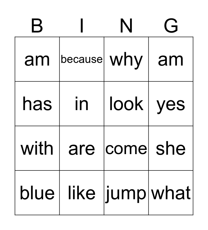 This bingo card has 16 words: like, she, why, am, with, because, come, jump, has, in, blue, am, are, yes, look and what.