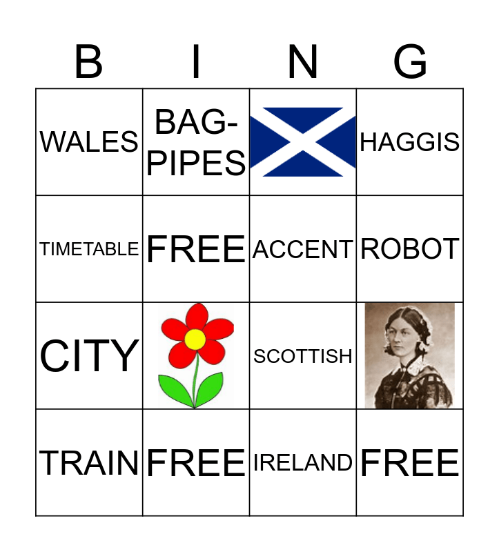 This bingo card has 3 images and 13 words: FREE, WALES, CITY, BAG-PIPES, SCOTTISH, IRELAND, TIMETABLE, FREE, TRAIN, HAGGIS, ROBOT, ACCENT and FREE.