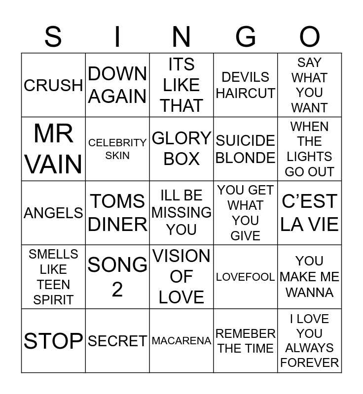 This bingo card has 25 words: SONG 2, MACARENA, GLORY BOX, STOP, SAY WHAT YOU WANT, CRUSH, MR VAIN, DOWN AGAIN, YOU GET WHAT YOU GIVE, VISION OF LOVE, SUICIDE BLONDE, ANGELS, LOVEFOOL, YOU MAKE ME WANNA, CELEBRITY SKIN, I LOVE YOU ALWAYS FOREVER, C’EST LA VIE, ITS LIKE THAT, WHEN THE LIGHTS GO OUT, TOMS DINER, ILL BE MISSING YOU, SECRET, SMELLS LIKE TEEN SPIRIT, DEVILS HAIRCUT and REMEBER THE TIME.