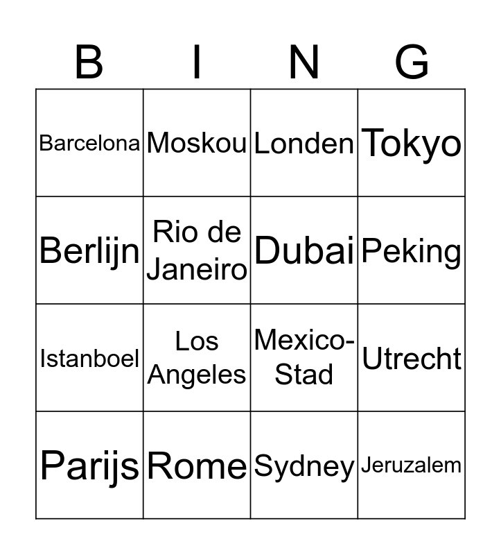 This bingo card has 20 words: Utrecht, Rotterdam, Londen, Brussel, Parijs, Berlijn, Rome, Barcelona, Istanboel, Moskou, Los Angeles, Mexico-Stad, Rio de Janeiro, Jeruzalem, Dubai, Kaapstad, Peking, Tokyo, Sydney and New York.