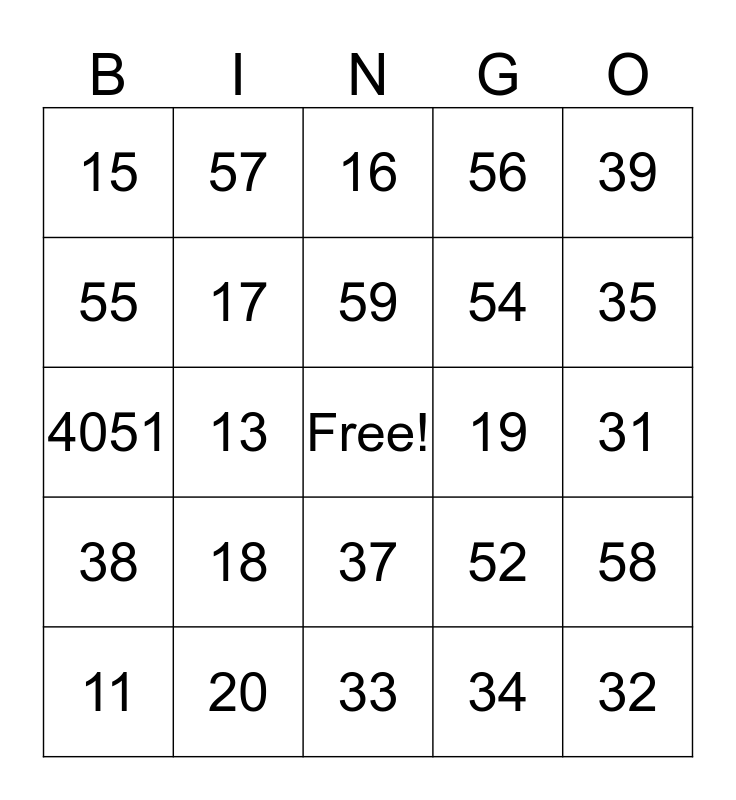This bingo card has a free space and 29 words: 11, 12, 13, 14, 15, 16, 17, 18, 19, 20, 31, 32, 33, 34, 35, 36, 37, 38, 39, 4051, 52, 53, 54, 55, 56, 57, 58, 59 and 60.