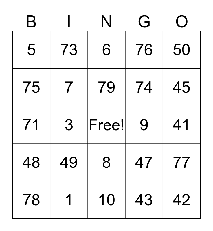 This bingo card has a free space and 30 words: 1, 2, 3, 4, 5, 6, 7, 8, 9, 10, 41, 42, 43, 44, 45, 46, 47, 48, 49, 50, 71, 72, 73, 74, 75, 76, 77, 78, 79 and 80.