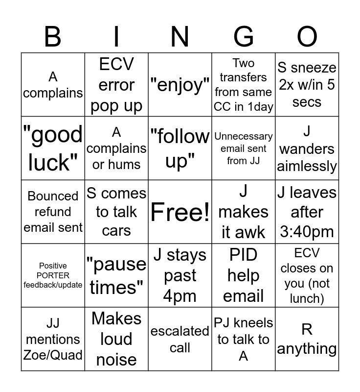 This bingo card has a free space and 25 words: "pause times", escalated call, "follow up", JJ mentions Zoe/Quad, S sneeze 2x w/in 5 secs, A complains, "good luck", ECV error pop up, J makes it awk, J stays past 4pm, Unnecessary email sent from JJ, Bounced refund email sent, PID help email, ECV closes on you (not lunch), A complains or hums, Internet down, J leaves after 3:40pm, "enjoy", J wanders aimlessly, S comes to talk cars, R anything, Makes loud noise, Positive PORTER feedback/update, Two transfers from same CC in 1day and PJ kneels to talk to A.
