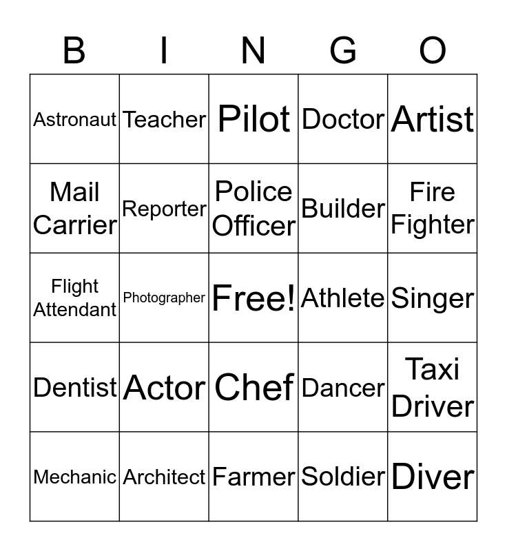 This bingo card has a free space and 24 words: Actor, Architect, Police Officer, Mechanic, Artist, Astronaut, Mail Carrier, Teacher, Athlete, Chef, Builder, Flight Attendant, Dancer, Taxi Driver, Reporter, Soldier, Singer, Pilot, Fire Fighter, Photographer, Diver, Dentist, Doctor and Farmer.