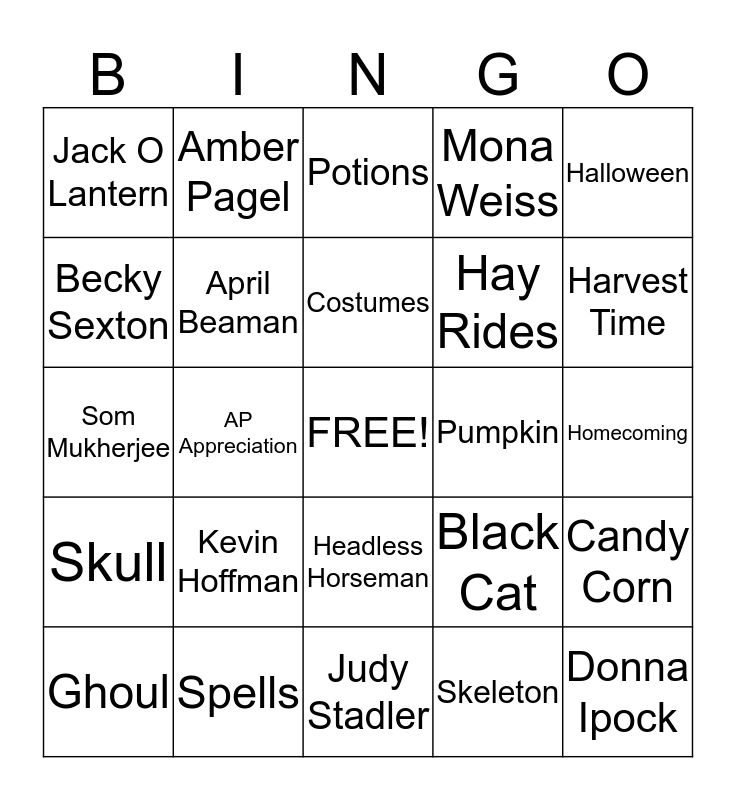 This bingo card has a free space and 50 words: Matt Patrick, Donna Ipock, Jan Murbach, Judy Stadler, Kevin Hoffman, Cindy Compton, Amber Pagel, Mindy Newkirk, Becky Sexton, Floy Scott, April Beaman, Mona Weiss, Candy Corn, Black Cat, Ghosts, Trick or Treat, Costumes, Pumpkin, Vampire, Halloween, AP Appreciation, Skeleton, Jack O Lantern, Hay Rides, Spider, Scarecrow, Harvest Time, Cauldron, Potions, Headless Horseman, Raking Leaves, Apple Cider, Creepy, Witch, Spells, Cool Weather, Pumpkin, Coffin, Bobbing for Apples, Homecoming, Haunted Houses, Vampire, Mummy, Skeleton, Ghoul, Som Mukherjee, Pet Cemetary, Thrills and Chills, Skull and Boo.