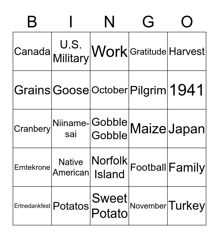 This bingo card has a free space and 24 words: Ertnedankfest, Native American, October, November, Harvest, Canada, U.S. Military, Work, Maize, Japan, Cranbery, Goose, Football, Family, Grains, Potatos, Sweet Potato, Gratitude, 1941, Erntekrone, Niiname-sai, Norfolk Island, Pilgrim and Turkey.