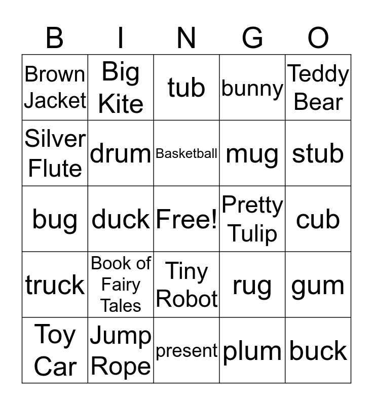 This bingo card has a free space and 24 words: Book of Fairy Tales, Jump Rope, Basketball, Toy Car, Teddy Bear, Brown Jacket, Silver Flute, Big Kite, Pretty Tulip, Tiny Robot, mug, bug, rug, gum, drum, plum, cub, tub, stub, duck, buck, truck, bunny and present.