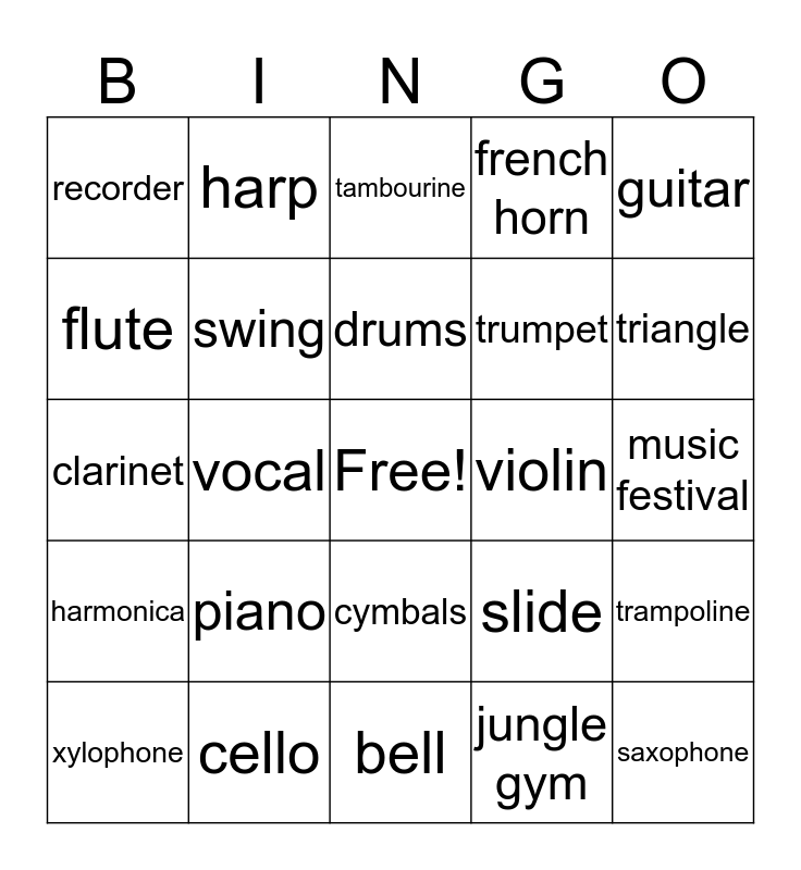 This bingo card has a free space and 24 words: piano, cello, drums, xylophone, guitar, recorder, flute, harp, violin, cymbals, trumpet, clarinet, slide, trampoline, swing, jungle gym, music festival, tambourine, triangle, vocal, saxophone, harmonica, french horn and bell.
