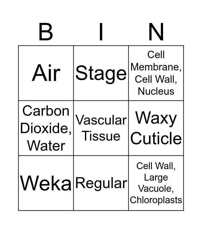 This bingo card has 21 words: Eye Piece, Arm, Stage, Fine Focus Knob, Light, Weka, Air, Cell Membrane, Cell Wall, Nucleus, Irregular, Regular, Cell Wall, Large Vacuole, Chloroplasts, Carbon Dioxide, Water, Glucose, Oxygen, Light, Chlorophyll, Waxy Cuticle, Epidermis, Palisade, Spongy Mesophyll, Vascular Tissue, Stomata and Guard Cells.