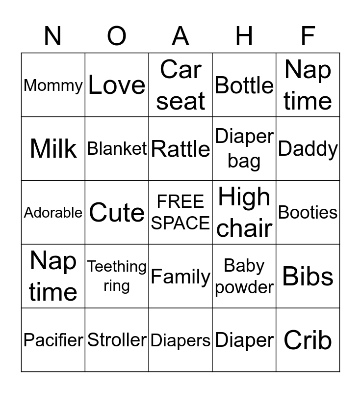 This bingo card has a free space and 24 words: Teething ring, Stroller, Rattle, Pacifier, Nap time, Mommy, Milk, Love, High chair, Family, Diaper bag, Adorable, Baby powder, Bibs, Blanket, Diaper, Booties, Car seat, Daddy, Cute, Crib, Nap time, Bottle and Diapers.