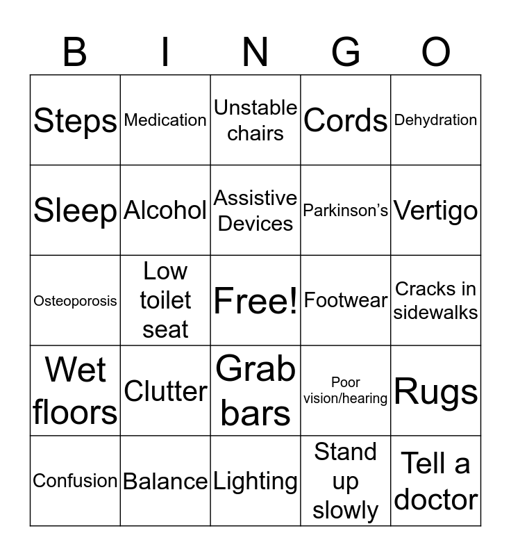 This bingo card has a free space and 24 words: Clutter, Balance, Assistive Devices, Confusion, Dehydration, Steps, Sleep, Medication, Footwear, Grab bars, Parkinson’s, Osteoporosis, Poor vision/hearing, Rugs, Alcohol, Stand up slowly, Cracks in sidewalks, Unstable chairs, Vertigo, Low toilet seat, Tell a doctor, Wet floors, Cords and Lighting.