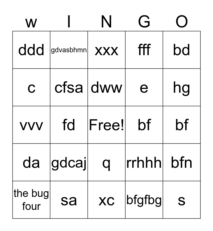 This bingo card has a free space and 24 words: the bug four, gdcaj, dww, bfgfbg, bd, ddd, gdvasbhmn, xxx, bf, bf, vvv, cfsa, rrhhh, bfn, c, sa, xc, fff, hg, da, fd, q, e and s.