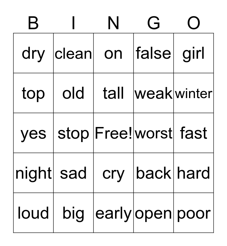 This bingo card has a free space and 24 words: sad, big, tall, loud, girl, dry, top, clean, worst, cry, weak, yes, back, hard, old, open, fast, on, winter, stop, poor, night, false and early.