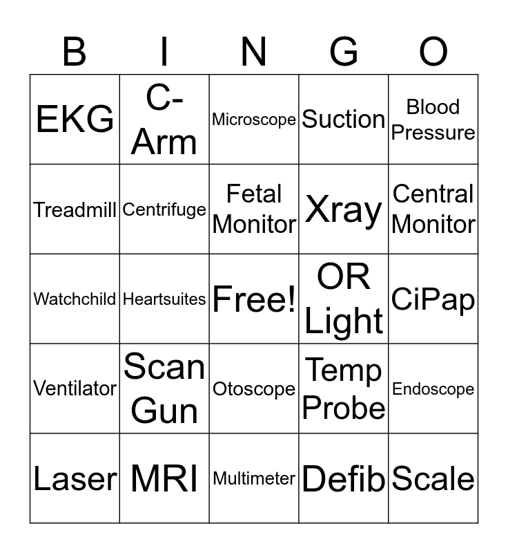 This bingo card has a free space and 60 words: Dinamap, MRI, CT, Ventilator, Defib, Ultrasound, Centrifuge, Lift, Xray, IV pump, Suction, Bilimeter, Treadmill, Telebox, Pacemaker, EKG, Scale, Blood Pressure, Autoclave, Fetal Monitor, OR Light, Microscope, Laser, Endoscope, Bladder Scanner, Syringe Pump, Biliblanket, Blood Warmer, Central Monitor, Holter Monitor, OR table, Anesthesia, Boom, Capsule, C-Arm, Mammo, Vericis, Heartsuites, Capnography, Watchchild, R4, Scan Gun, CiPap, Tee Probe, Temp Probe, SpO2, GO, Lifepak, Vitals Machine, Otoscope, Multimeter, Bare Hugger, Cast Cutter, Colposcope, Hearing Aid, Greg Herr, CE Tag, SM Tag, Battery and Package.