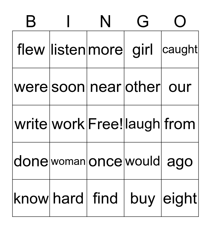 This bingo card has a free space and 24 words: woman, hard, near, know, caught, flew, were, listen, laugh, once, other, write, would, ago, soon, buy, from, more, our, work, eight, done, girl and find.