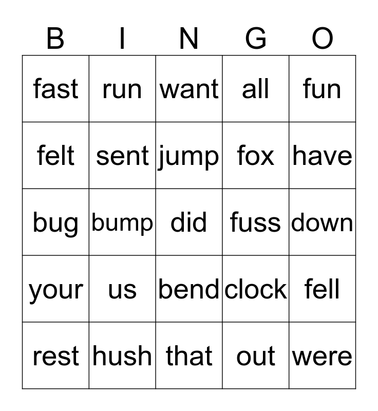 This bingo card has a free space and 24 words: us, hush, jump, rest, fun, fast, felt, run, fuss, bend, fox, bug, clock, fell, sent, out, down, want, have, bump, were, your, all and that.