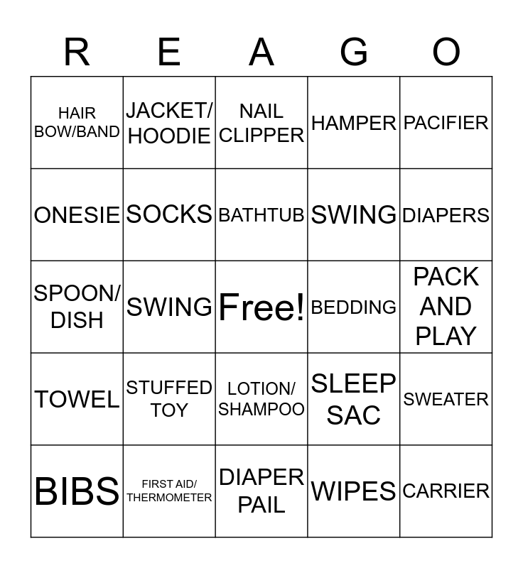 This bingo card has a free space and 29 words: BIBS, MOBILE, SWING, SHOES, HAIR BOW/BAND, NAIL CLIPPER, SOCKS, STUFFED TOY, BEDDING, FIRST AID/ THERMOMETER, PACK AND PLAY, CARRIER, DIAPER PAIL, WIPES, DIAPERS, BOTTLE, LOTION/ SHAMPOO, TOWEL, PACIFIER, SPOON/ DISH, SLEEP SAC, OUTFIT, SWING, ONESIE, HAMPER, JACKET/ HOODIE, SWEATER, BATHTUB and RECEIVING BLANKET.