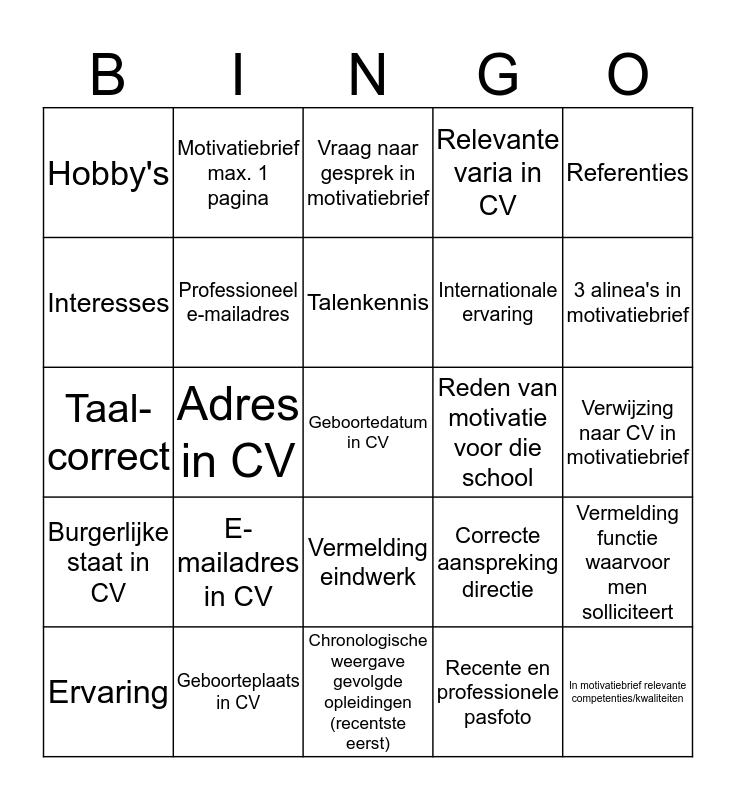 This bingo card has 25 words: E-mailadres in CV, Chronologische weergave gevolgde opleidingen (recentste eerst), Talenkennis, Ervaring, Referenties, Hobby's, Interesses, Motivatiebrief max. 1 pagina, Reden van motivatie voor die school, Vermelding eindwerk, Internationale ervaring, Taal-correct, Correcte aanspreking directie, Vermelding functie waarvoor men solliciteert, Professioneel e-mailadres, In motivatiebrief relevante competenties/kwaliteiten, Verwijzing naar CV in motivatiebrief, Vraag naar gesprek in motivatiebrief, 3 alinea's in motivatiebrief, Adres in CV, Geboortedatum in CV, Geboorteplaats in CV, Burgerlijke staat in CV, Relevante varia in CV and Recente en professionele pasfoto.