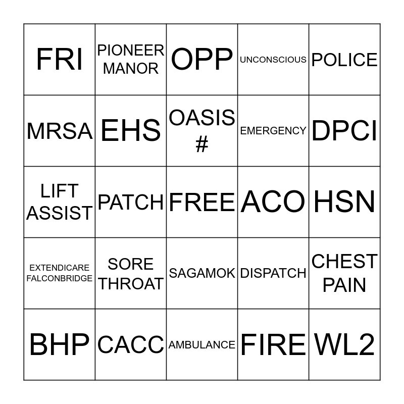 This bingo card has a free space and 24 words: SORE THROAT, CACC, OASIS #, BHP, POLICE, FRI, MRSA, PIONEER MANOR, ACO, SAGAMOK, EMERGENCY, LIFT ASSIST, DISPATCH, CHEST PAIN, EHS, FIRE, HSN, OPP, DPCI, PATCH, WL2, EXTENDICARE FALCONBRIDGE, UNCONSCIOUS and AMBULANCE.