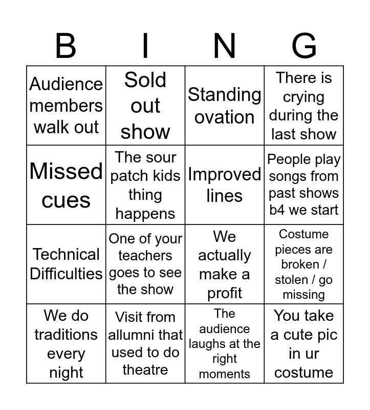 This bingo card has 16 words: Visit from allumni that used to do theatre, Costume pieces are broken / stolen / go missing, Standing ovation, Audience members walk out, Technical Difficulties, Sold out show, We actually make a profit, The audience laughs at the right moments, Missed cues, The sour patch kids thing happens, We do traditions every night, There is crying during the last show, One of your teachers goes to see the show, People play songs from past shows b4 we start, Improved lines and You take a cute pic in ur costume.