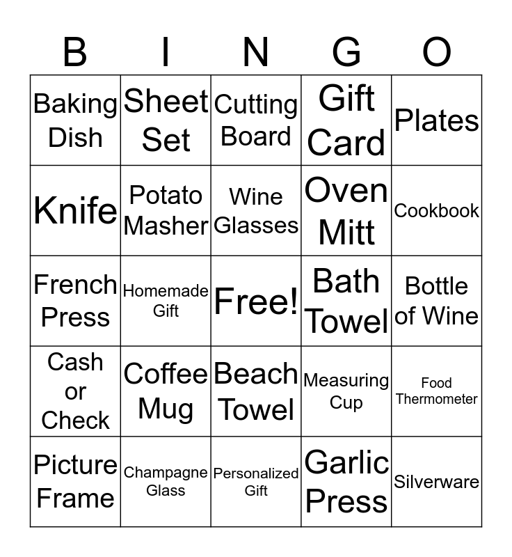 This bingo card has a free space and 24 words: Coffee Mug, Champagne Glass, Wine Glasses, Picture Frame, Plates, Baking Dish, Knife, Sheet Set, Bath Towel, Beach Towel, Oven Mitt, French Press, Measuring Cup, Food Thermometer, Potato Masher, Garlic Press, Bottle of Wine, Cutting Board, Cookbook, Homemade Gift, Silverware, Cash or Check, Gift Card and Personalized Gift.
